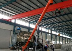 人工将原料包装袋放置在输送皮带机上,皮带输送机包装袋送至粉状化肥拆包机内,由旋转破包装置将包装袋割开,原料由滚动筛筛孔落入出料受料斗内,包装袋由旋转的滚筒旋至排袋机排除,割包产生的扬尘经粉状化肥拆包机自带的布袋除尘气处理,布袋收集的粉尘通过脉冲清灰装置落入粉状化肥拆包机内,实现的粉尘的再次利用,经布袋除尘器处理的空气可以直接排放在室内。拆解的原料经出料螺旋,可以配套提升机,螺旋输送机,管链输送机,气力输送,进行配料,搅拌,包装。