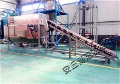 袋装粉粒体物料由皮带输送机传送至45度角的华半尚并依靠重力沿滑板下滑,在下滑过程中有快速转动的刀片将包装袋隔开,被割开的残袋和物料滑入滚筒筛进行筛分。从滚筒筛落下的物料有螺旋输送机输出,破损的包装袋、杂质、结块物料被滚筒筛带出机体。割刀破袋过程中引起的粉尘由布袋式除尘器捕捉并抖落入螺旋输送机(由螺旋输送机输出的物料可通过管链输送机或者气力输送装置,输送至物料储罐中)。